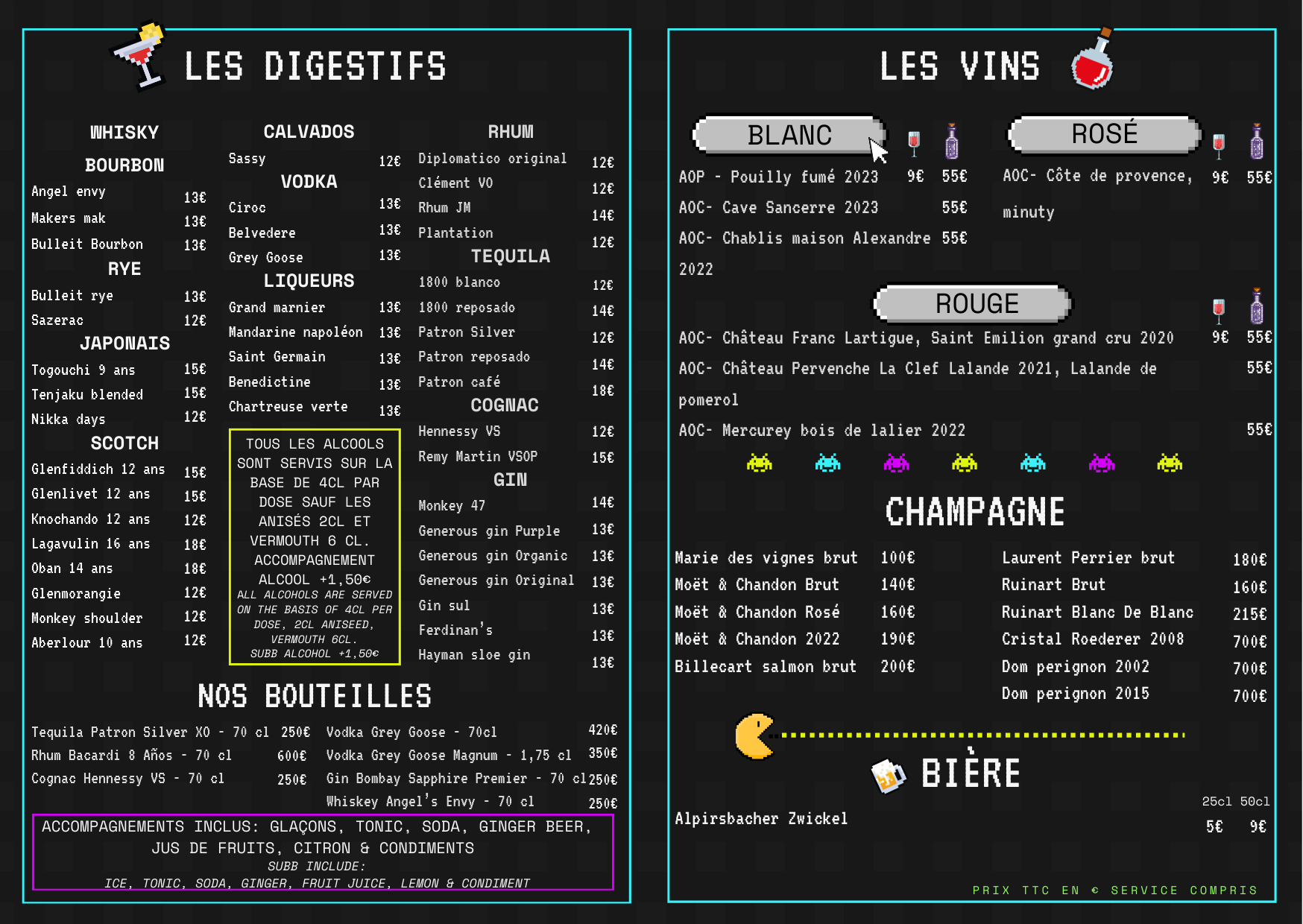 Prix TTC en € • Service compris • Tous les alcools servis sur la base de 4cl par dose